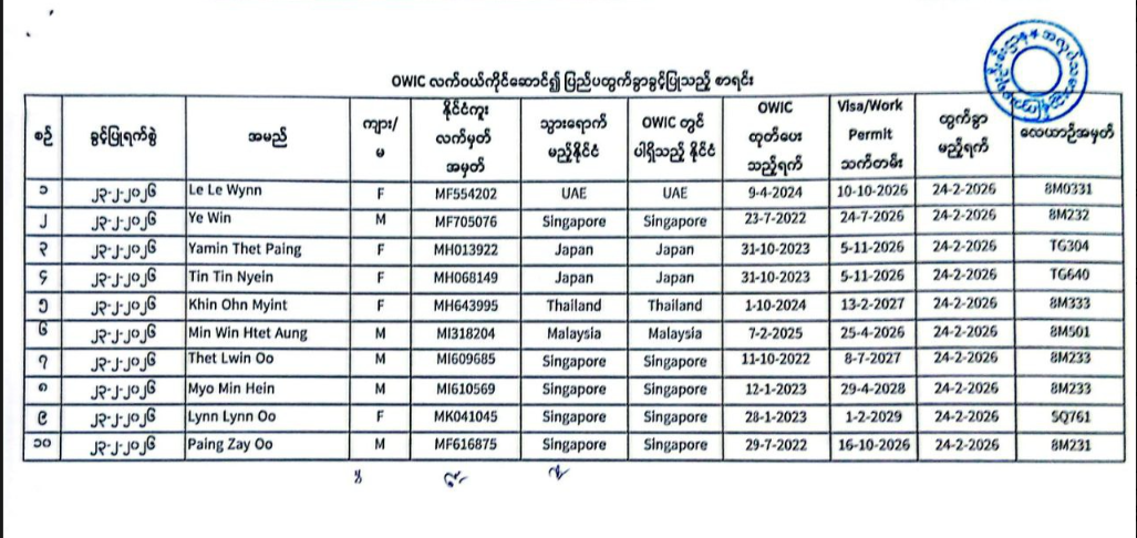 - သက်တမ်းရှိနေသည့်ပြည်ပအလုပ်အကိုင်အလုပ်သမားသက်သေခံကတ်(OWIC) ရှေ့/နောက်မိတ္တူ၊