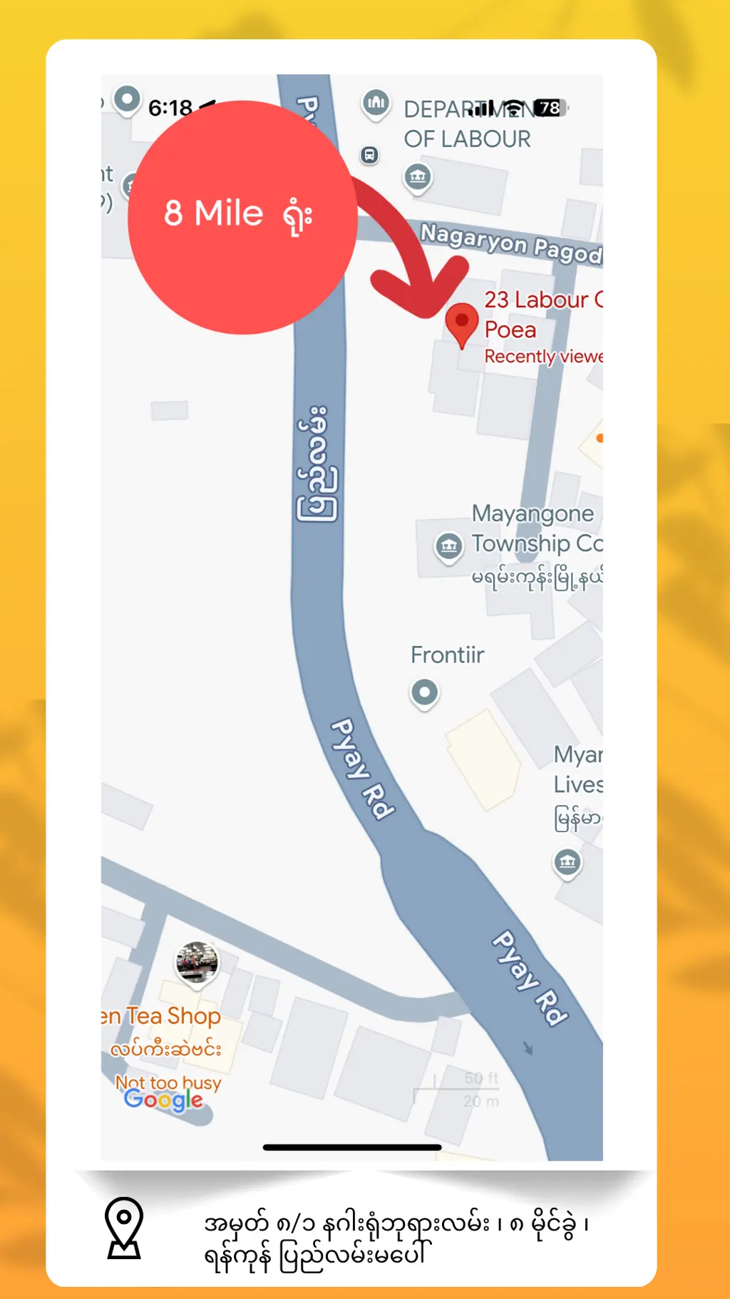 - Labour Card (ခေါ်) အလုပ်သမားကဒ် ကို မိမိ နေထိုင်ရာ မြို့နယ်တွင်လဲလုပ်လို့ရပါသည်။ အချိန်ရသူများ မိမိနေထိုင်ရာ မြို့နယ်တွင် လုပ်ထားပါက ၈ မိုင်ရုံးတွင် ထပ်လုပ်စရာ မလိုအပ်ပါ။
